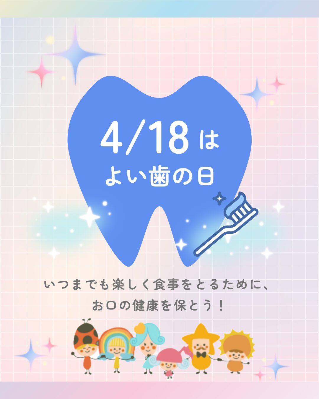 明日は 何の日? 2026/04/17 明日4月18日は、『よい歯の日』とされています🦷✨ いつまでも良い歯で過ごしていくために、定期検診でお口の環境を確認することも大事! ですが、毎日のハミガキもとっても大切です🪥 普段お使いのハブラシの状態はどうでしょうか? 🦷毛先は開いていないかな? 🦷1ヶ月以上使い続けていないかな? など、ぜひこの機会にチェックしてみましょう! フロスや洗口液のストックも、合わせて確認しておきましょう!